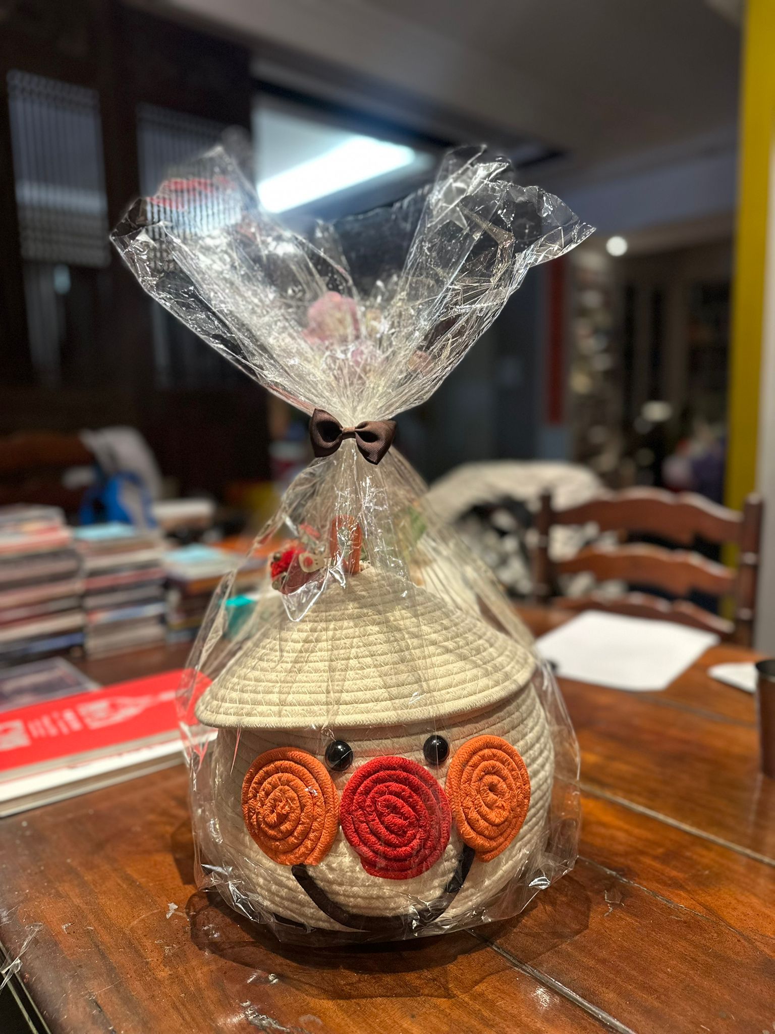 The inquisitive basket houses all items such as baked goods such as the Mr. Gingerbread man, A Jar of biscotti, A red velvet Cookie, A slice of Brownie and a box of unstoppable corn flakes.